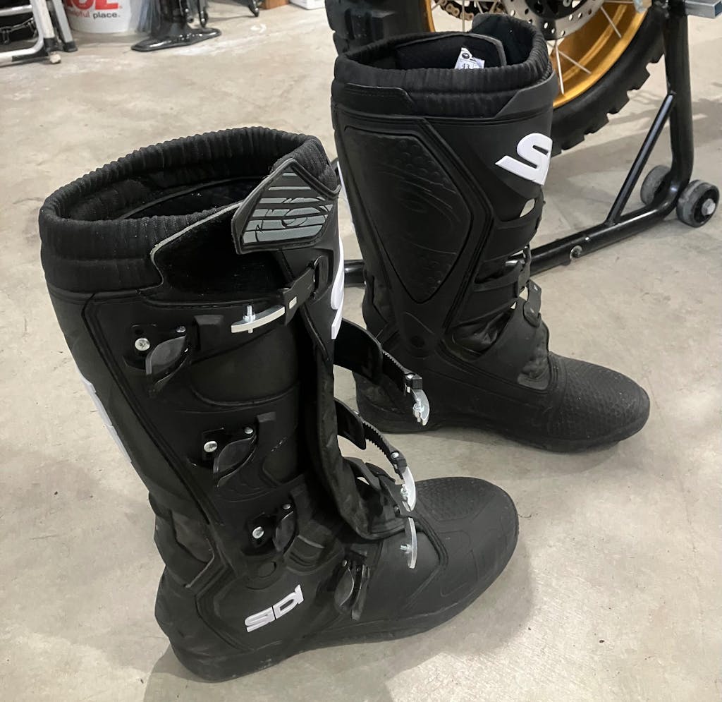 For the harder stuff I wear Forma's Predator MX boots, but they're (understandably) too stiff when you know you'll be in lighter conditions and may need to help pick up bikes throughout the day. I had been downshifting to Sidi Adventure and Gaerne trials boots, but those aren't protective enough for unpredictable twin track. Enter the Sidi X-Power SC. 4-buckle security, plenty wide toe box (I can't handle Crossfires), and a good balance of TPU and fabric to offer moderate protection while retaining trail maneuverability and comfort. They even do a great job keeping 6-ish inches of muddy water out - I can personally attest to it. No, they're not GoreTex waterproof for adventure rides, and no they're not going to save your feet from a nasty rock strike, but they're similar to a Tech 7 and will readily handle sticks and mild falls while not wearing you down all day like a "ski boot" can. I'd call them a fantastic value when on sale. Tip: consider orthotics or a D3O sole for extra comfort!